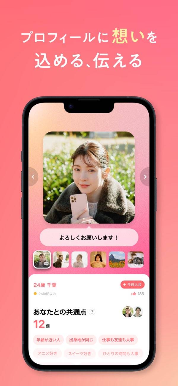 プロフィールはテンプレートがあって書きやすかったです!自分から調べるのがめんどくさい人も、心理テストをすることでアプリがおすすめの方をピックアップしてくれます!価値観の合う人が見つけやすいのではないかなと思います!操作も簡単で使いやすいです!また、メッセージに対しても内容面や量に関してのアドバイスをくれたり、連絡先の交換については警告を出してくれるなど安全面に考慮したりしているところもいいと思いました!