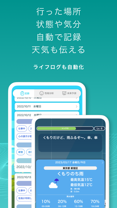 自分の性格を診断できます。慎重派か行動派か、一人でいるのが好きかみんなといるのが好きかなどの質問を通して自分の性格を把握。自分が選んだ回答は行動記録に記録されます。