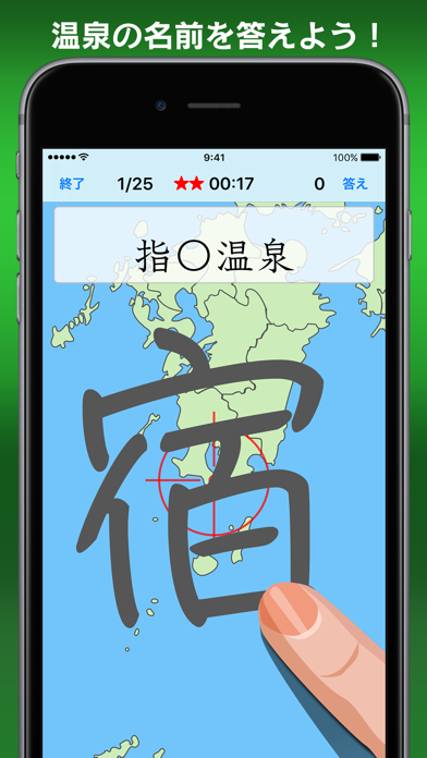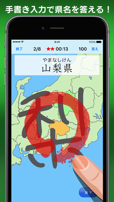 都道府県名を漢字で書いて答える、ちょっと難しい地理クイズアプリ。地名はわかっても漢字は何だっけ? というケースも意外とあり、都道府県だけでなく漢字を覚える機会にもなるでしょう。また都道府県のパズルも収録されているので、形でも都道府県を覚えられます。
