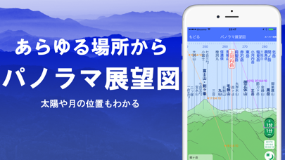 「パノラマ展望図機能」では、どんな場所からでも山の名前を確認でき、自宅や山の頂上から見える山々の名前が一目で分かります。