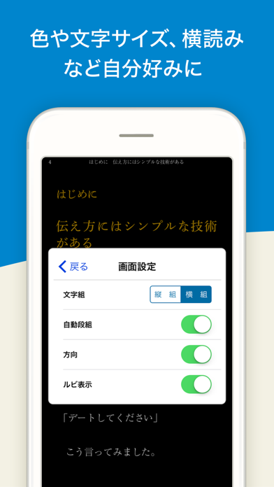 - 画面設定・画面効果・ページめくり設定など、読みやすいように調整可能