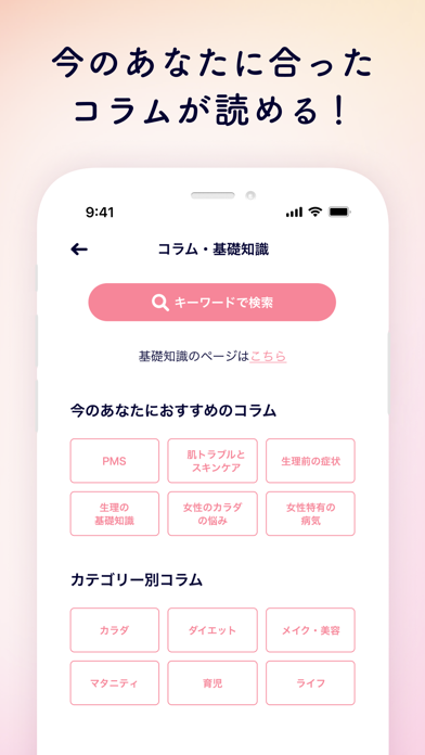 生理日を記録するだけで、次の生理予定日や排卵日の目安がわかる体調管理アプリです。生理にともなうカラダやココロのゆらぎも毎日手軽にチェック可能。旅行や大事な日をスムーズに計画したい人にもぴったりの使いやすさです。