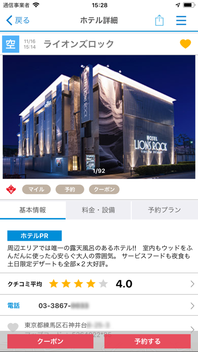 各ホテルの詳細ページでは、部屋の写真や料金情報、設備情報などを確認できます。クチコミや星評価も見られるので、ほかの利用者の意見も参考にできますよ。また、詳細ページから直接ルート検索が行えるのもとても便利です。