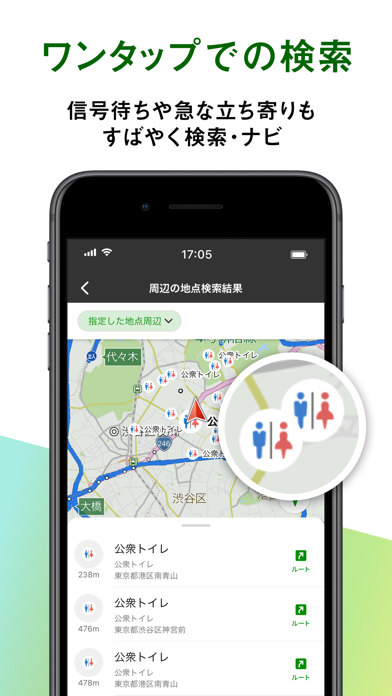 地図をスクロールする、画面上の検索欄から検索するなどして、目的地を表示します。目的地をタップして「ルート検索」を選ぶと、ルートの候補を表示できます。