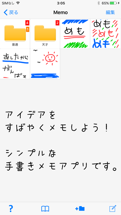 テキスト入力の必要がない手書きメモアプリです。必要最低限の機能のみが詰まっているので、使いやすさは抜群です。またフォルダ機能を利用して、メモを分類できるので後からチェックするときも簡単。共有機能を使えば、画像として手書きメモを送れますよ。