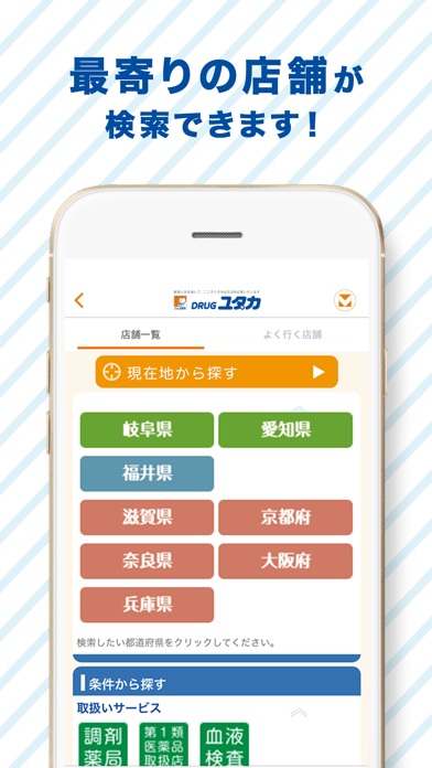 - どこにいても近くのドラッグユタカの店舗を見つけられる