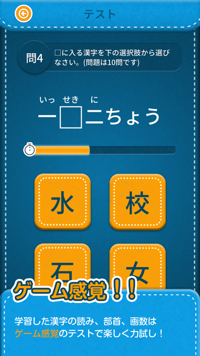 「テスト」モードでは、選択式の問題がランダムに出題されます。難易度設定が可能なため、自分のレベルに合わせて挑戦。この機能を利用することで、楽しみながら自然と漢字の意味や使い方を身につけられます。