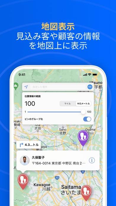 現在地付近の重要な顧客データを簡単に検索できます。計画的な訪問スケジュールを立て、効率よく次のアポイントメントへと移動。時間を有効に使い、より多くの訪問が可能になるでしょう。