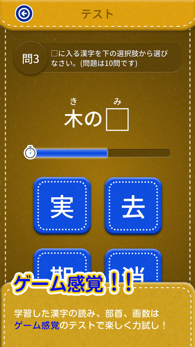 小学3年生で習う漢字を使った選択式のテストが受けられます。10問ずつ出題され、難易度の異なる問題が含まれています。テスト結果は記録されるため、自分の成績を振り返ることが可能。理解度をチェックし、どの漢字が苦手かを把握できます。