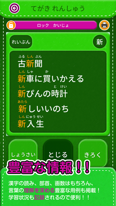 - 「漢字を書く」「テストする」「世界記録に挑戦」の3モードを収録