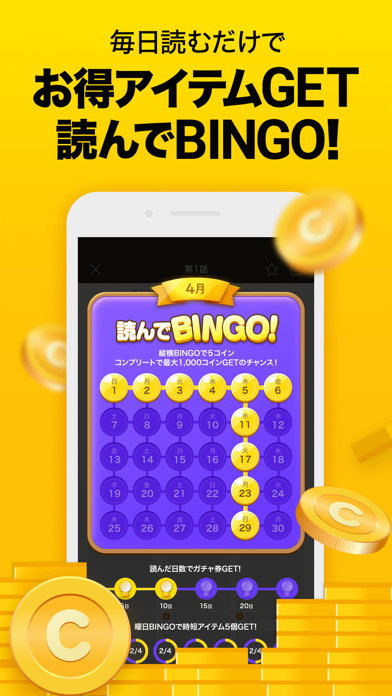 無料でたくさん読むなら、デイリーボーナスや「読んでBINGO」が大切。デイリーボーナスは広告視聴で、コインか時短アイテムを獲得できます。「読んでBINGO」は本アプリでマンガを読むと、時短アイテムやコインなどがもらえますよ。