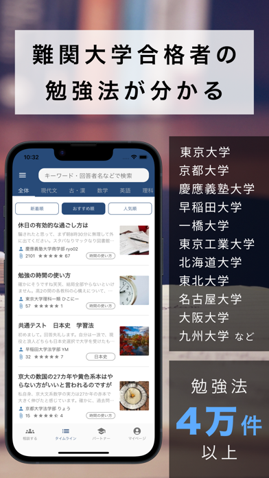 東大・京大・早稲田など、実際に合格した先輩たちの勉強法や、使っていた参考書、モチベの保ち方まで、幅広く投稿がそろっています。1日の過ごし方や試験直前期の過ごし方など、自分との違いにも気づけて、やる気アップのきっかけにもなるでしょう。いろんな合格パターンを知って、自分に合う方法を試していけます。