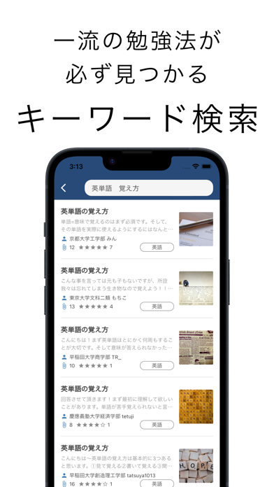 回答者は学生証などの認証が必要かつ、大学名もプロフィールに表示されているので信ぴょう性もバッチリ。塾や予備校では聞きにくい素朴な質問にも気軽に応じてもらえるので、独学派にも安心の存在です。