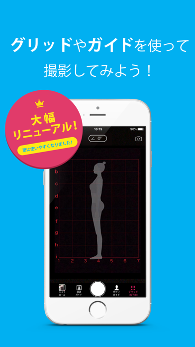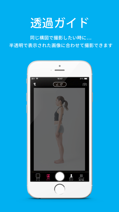 撮影時に前回の写真をうっすら重ねて表示できるので、顔や体の位置を合わせやすいのが特長です。さらに9種類のグリッド線や水平器を活用すれば、背景との位置関係までぴったり再現しやすくなります。比較用にパーフェクトな写真を撮っておけば、どこが変わったかがひと目で見えてモチベーションもアップ。