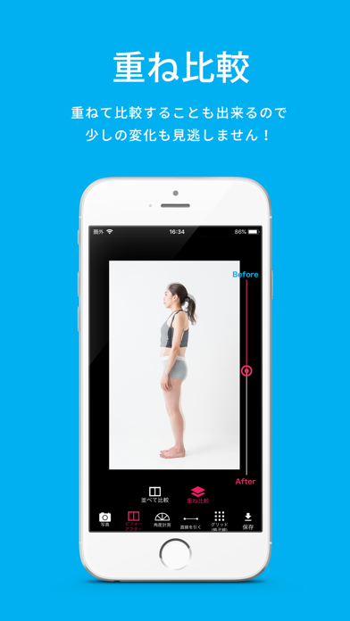 体の変化をビフォーアフターで見て楽しむ比較アプリです。写真を重ねたり、グリッド線や角度で見やすくしたりが可能。鏡だけではわかりにくい変化も見えるから、ダイエットや美容に前向きに取り組めますよ。