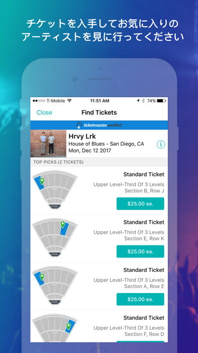 アーティスト情報はすべて画像付きで表示されます。検索画面はアーティスト名検索だけでなく位置情報を利用した近場のライブも探せるので、お休みの日には気軽にライブを見に行くことも可能です。