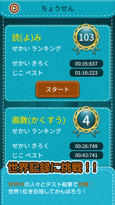 「世界記録に挑戦」モードでは、正解率やタイムでほかのユーザーと競い合えます。上位を目指して取り組むことで漢字に対する理解が深化します。楽しみながら学習を続けることができるでしょう。