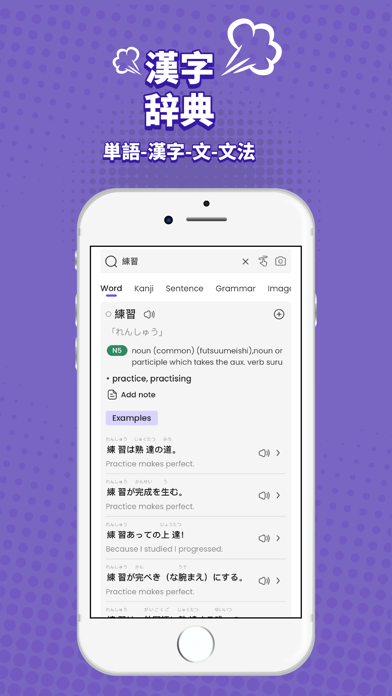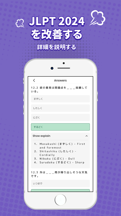 JLPTのN5〜N1のれんしゅうもんだいに、チャレンジができます。かくレベルのもんだいがたくさんあるため、あなたにあったべんきょうがかのうです。このアプリでべんきょうして、しけんにごうかくしてくださいね。