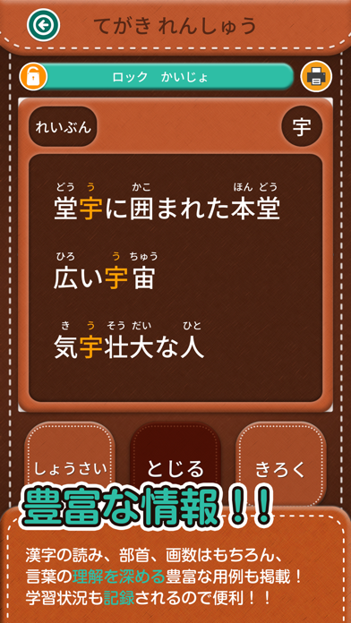 - 穴埋め問題・部首・画数からなるテストで、学んだ漢字をおさらいできる