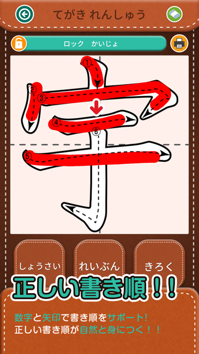 漢字をなぞることで正しい書き順を学習します。書き間違えた場合でも、消しゴム機能を使って簡単に修正できるため、何度でも練習が可能。正しい書き順を覚えることで、漢字の記憶がしっかりと定着しやすくなります。