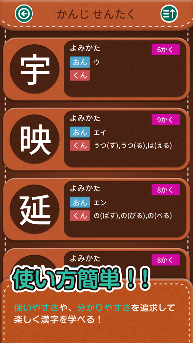 漢字の学習を楽しく効率的に進めたいなら、このアプリが最適。書き順や部首、画数を確認しながら書き取り練習ができるので、正しい書き順を覚えやすいです。