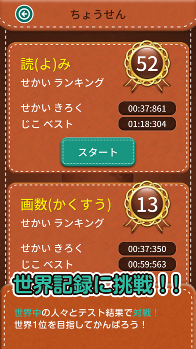 ほかのユーザーと漢字の理解を競う「世界記録に挑戦」モード。このモードでは正解率とタイムで順位が決まり、読み書きなどの正確性が高まるでしょう。競い合うことでモチベーションが高まります。