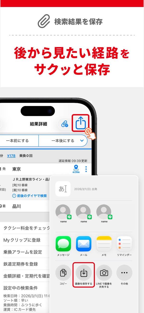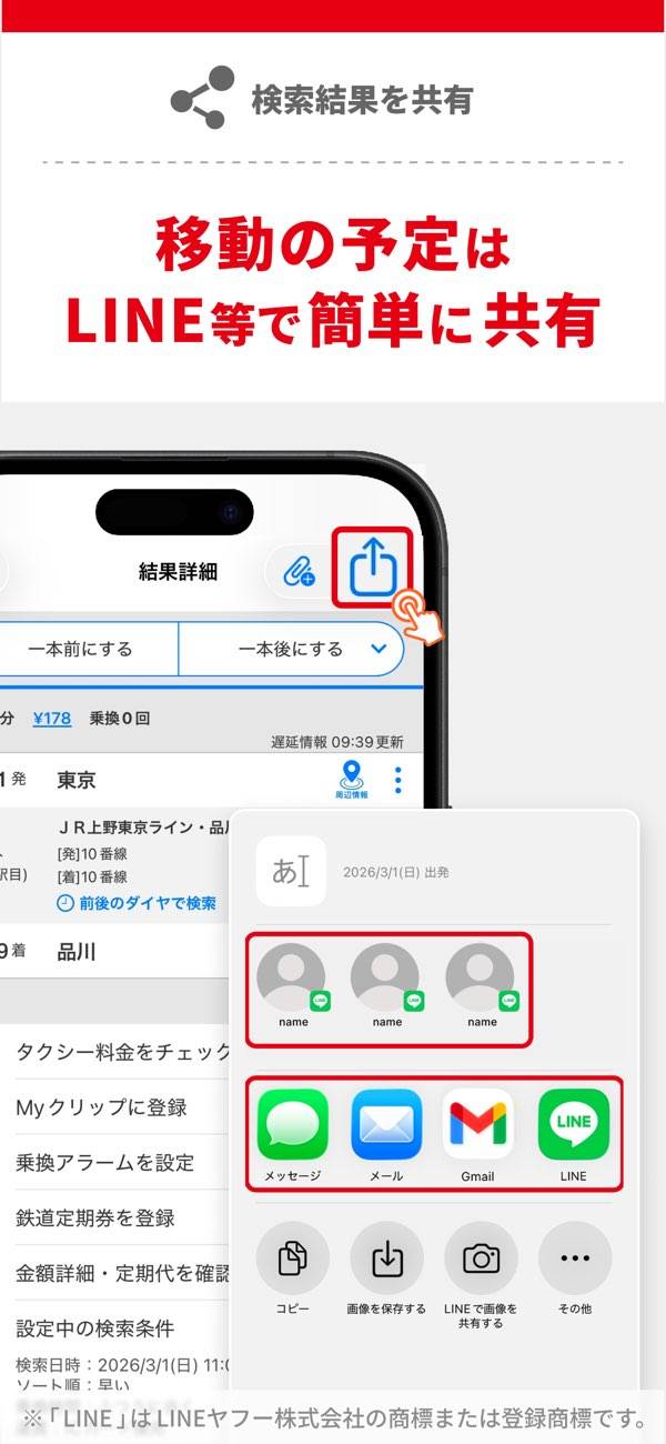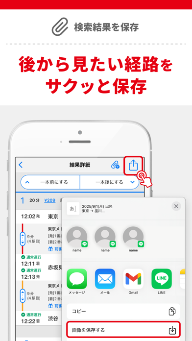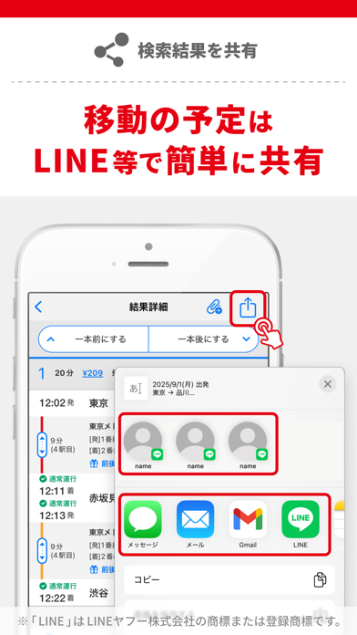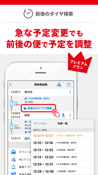 - 出発地から目的地までの経路を複数パターンで表示。早く着けるルートや乗り換えがラクな道順がすぐに見つかる