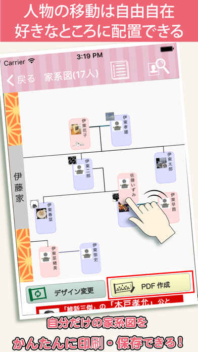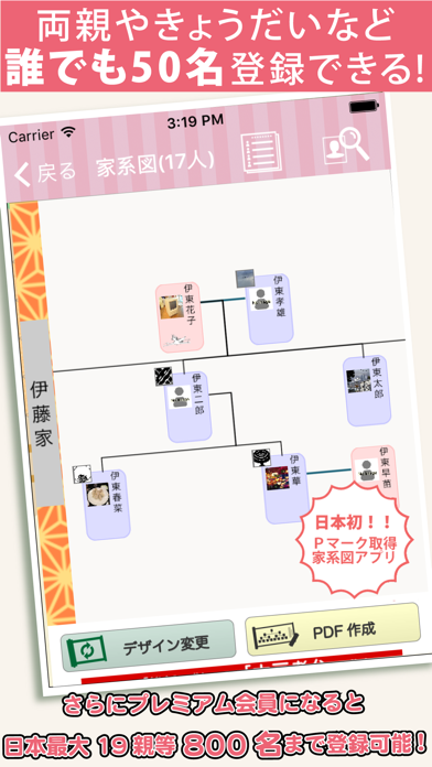 赤ちゃんからご先祖様までの家系図を作れるアプリです。さらに、「家族年表」機能で大切な記念日をひと目で確認可能! 親戚付き合いも円滑になります。