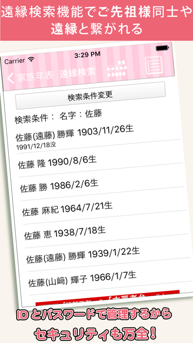 また、「遠縁検索」機能で広範なつながりをも探ることができます。家族の歴史に興味のある方や、親戚関係を整理したい方におすすめです。