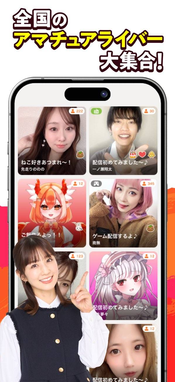 本アプリは顔出し雑談がメインジャンルと言えます。そのため特定のジャンルはライバーが少ないです。特にゲーム配信をしているライバーが少なく、平日の昼間だと観られるライブがない場合も。