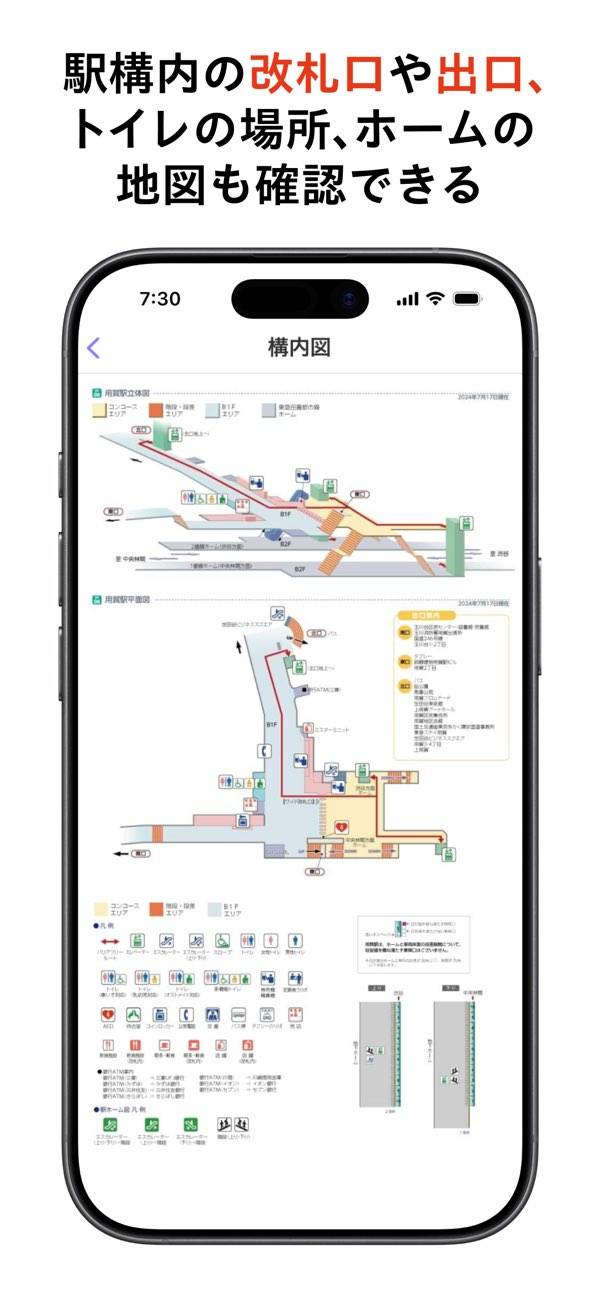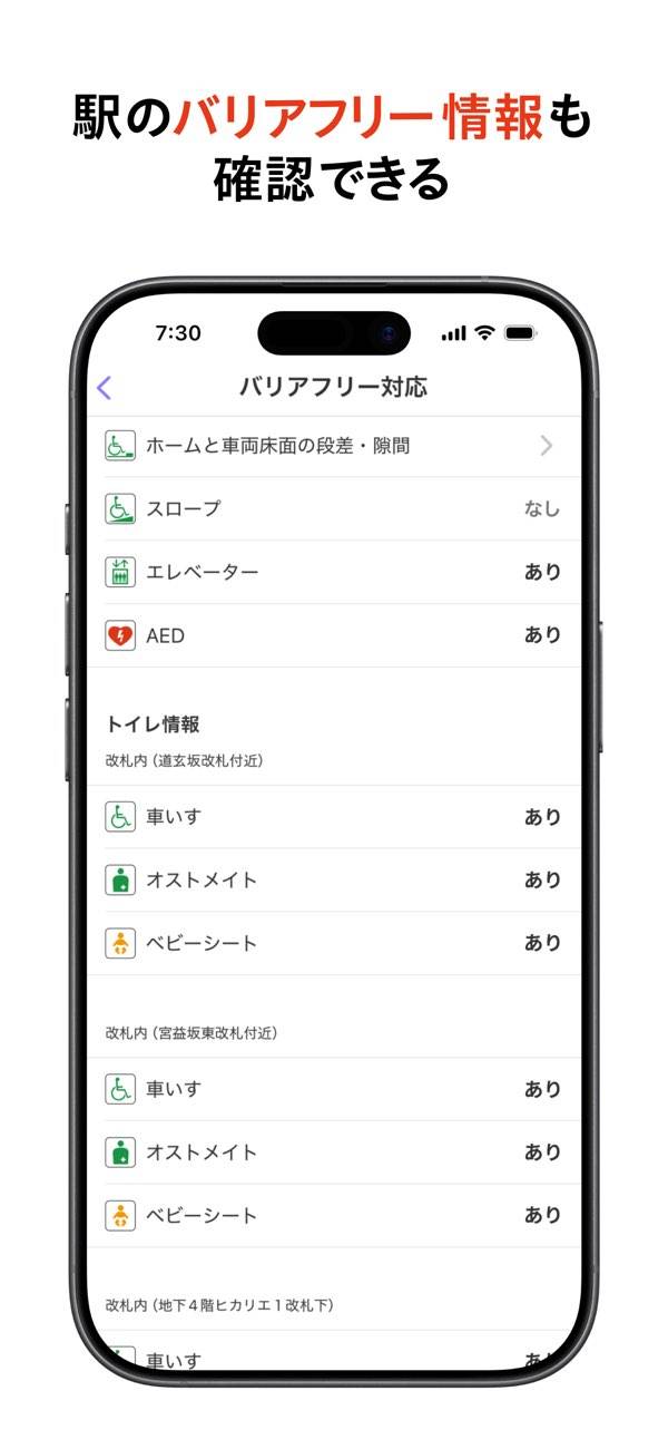 各路線の列車がどこを走っているかを、行き先や各駅への到着時刻の目安とあわせて確認可能。走行位置を見ることで列車がどれくらいで到着するかをイメージしやすくなり、待ち時間の不安も和らぎます。車両情報では、路線によって混み具合やフリースペースの位置まで把握でき、乗る位置を決める際の目安として役立ちます。