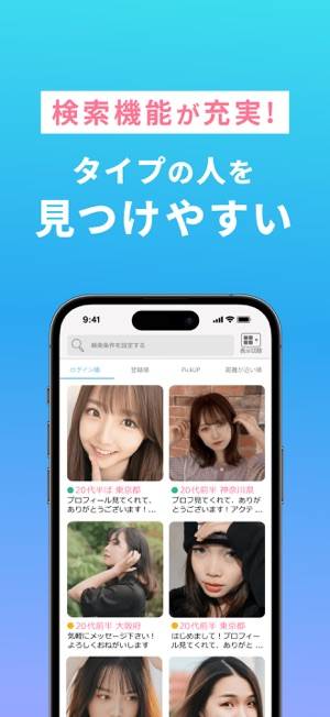 検索項目が20種類以上もあって、タイプの人が見つけやすいです。お相手の見た目や居住地はもちろんのこと、どんな目的で使っているかもわかるので、私自身もピッタリな人と出会えました。