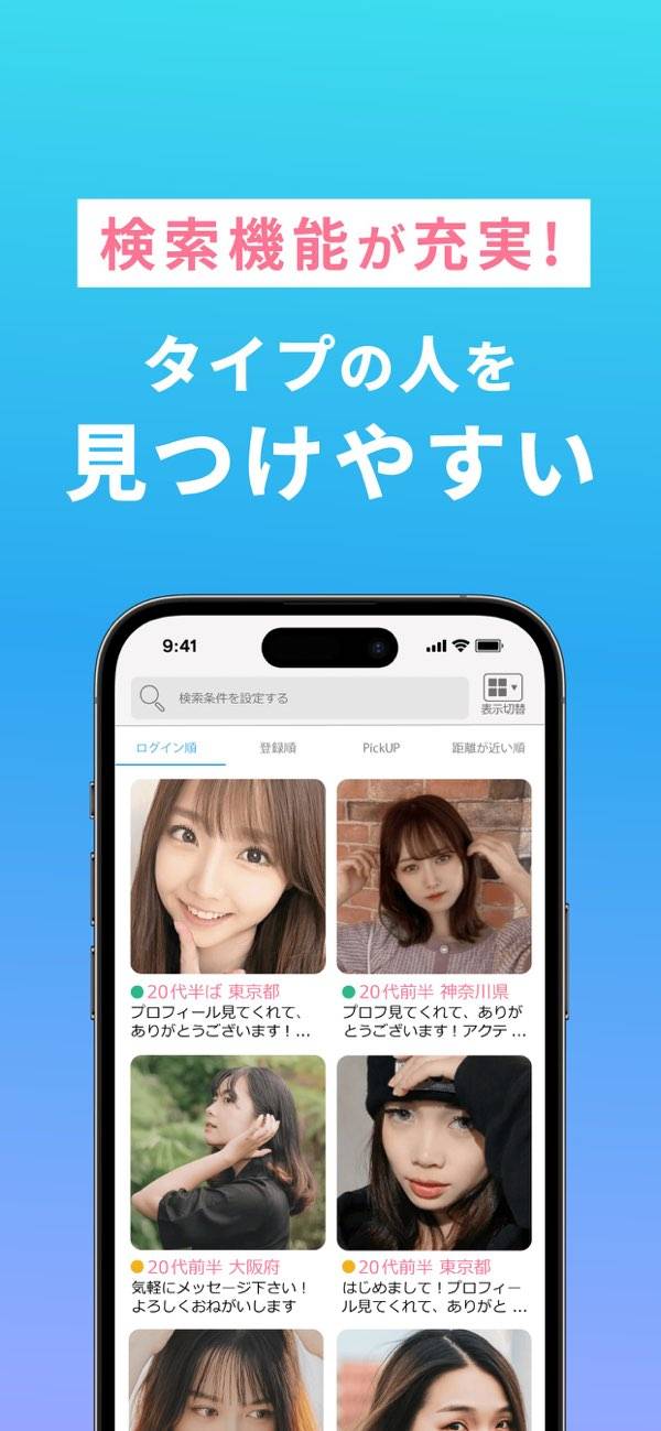 検索項目が20種類以上もあって、タイプの人が見つけやすいです。お相手の見た目や居住地はもちろんのこと、どんな目的で使っているかもわかるので、私自身もピッタリな人と出会えました。
