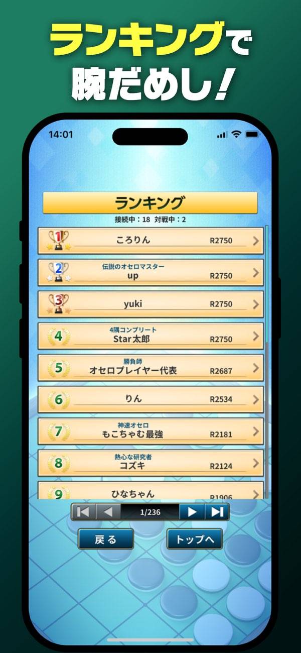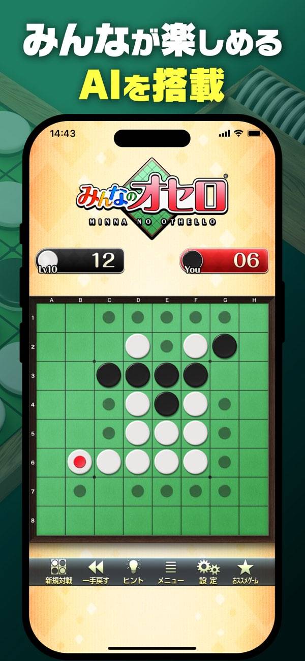 COMのレベルは30段階あり、自分のレベルに合わせて対戦できます。一手戻るやヒントなど初心者にやさしい機能もあり、オセロにだんだんとハマっていけるでしょう。対局の記録も残るので振り返ってみてください。