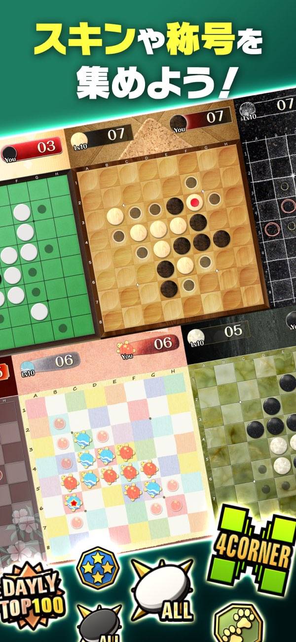 - 手書き風の盤・かわいいカメの盤など、オセロ盤を変えて遊べる