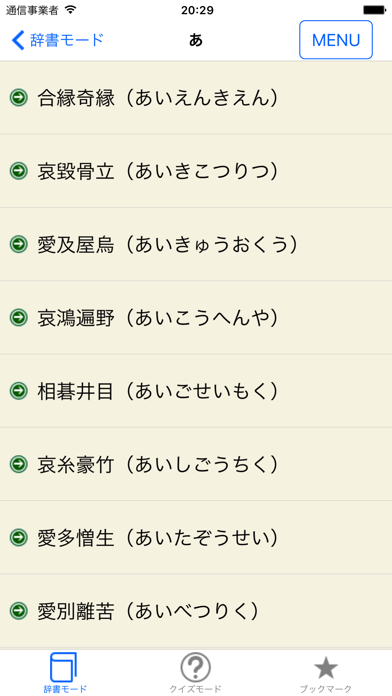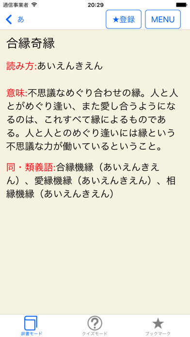 辞典と一緒にクイズモードもあり、気分転換に向いています。正解か不正解か当てたり、穴埋め問題があったりするわけではないので、クイズ感は若干弱め。ある程度習熟してから挑戦するといいでしょう。