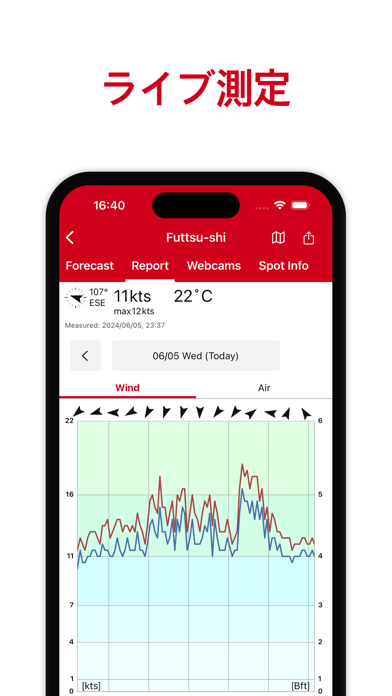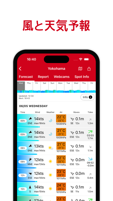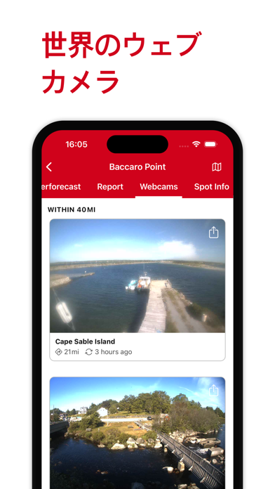 登録されているスポットを選択すると、詳細なデータが閲覧可能に。3時間ごとの風速や天気、波の高さなどを確認できます。(無料版の場合)一部のスポットでは、「Webcams」から天候状況を映像で確認ができる場合もあります。