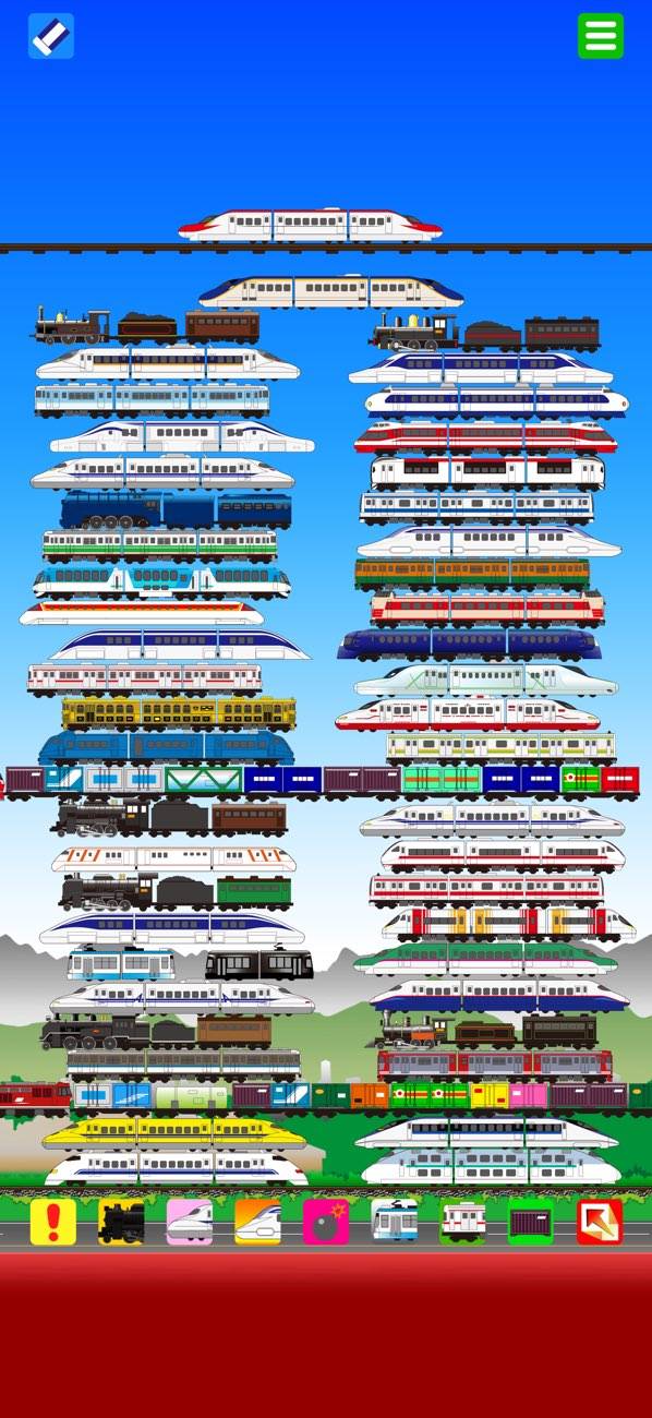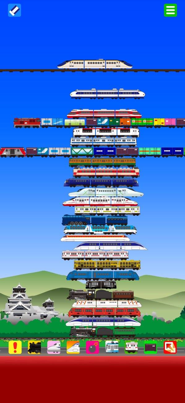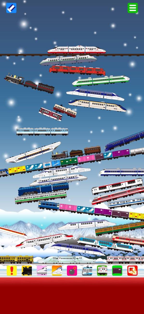 在来線や機関車などを積み上げられるパズルゲーム。パズルといってもクリアなどはなく、自由に積み上げて消して、また積み上げて消すの繰り返し。画面下にあるアイコンをタップすると電車が巨大化したり、積み上げた電車が爆発したりとさまざまなことが起こります。