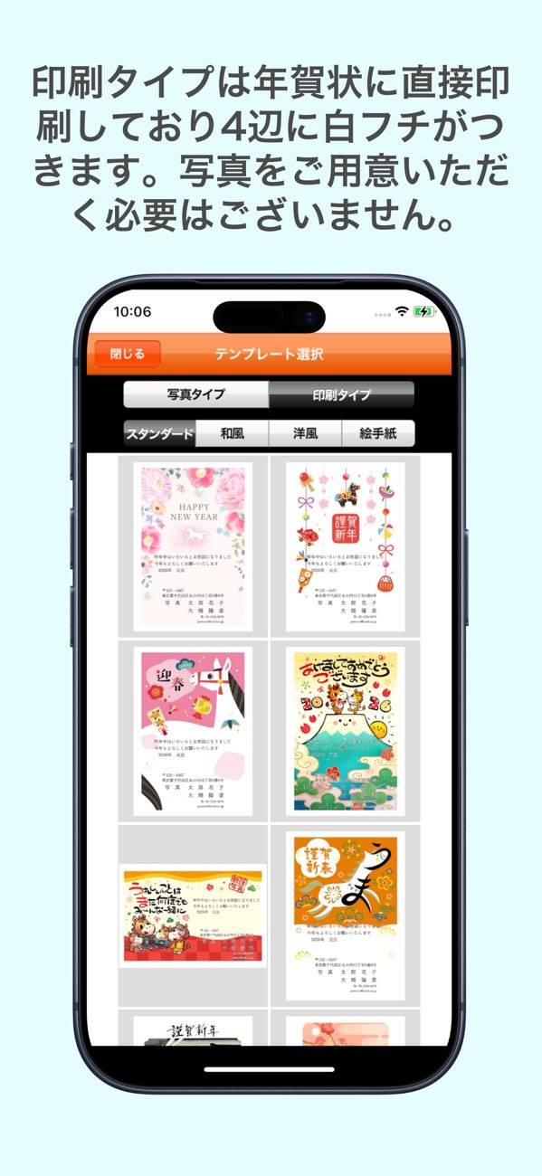 2種類の印刷タイプから選んで、年賀状を作成できます。テンプレートで簡単にデザインできるだけでなく、自身の動画リンクを二次元バーコードで印刷できるのが特徴的。受け取った人がバーコードをスキャンすると、動画が再生されます。ただほかの年賀状アプリに比べると、デザインテンプレートの種類が少なめです。