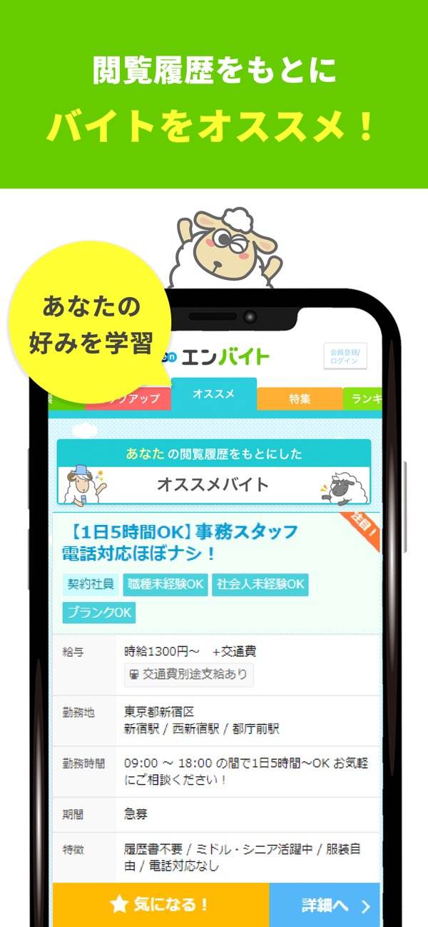 希望条件や閲覧履歴をもとに、アプリがおすすめの仕事を紹介してくれます。もちろん仕事に関する詳細な情報も確認可能。気になる求人があれば「気になる!」をタップしましょう。それだけで採用へ一歩前進します。