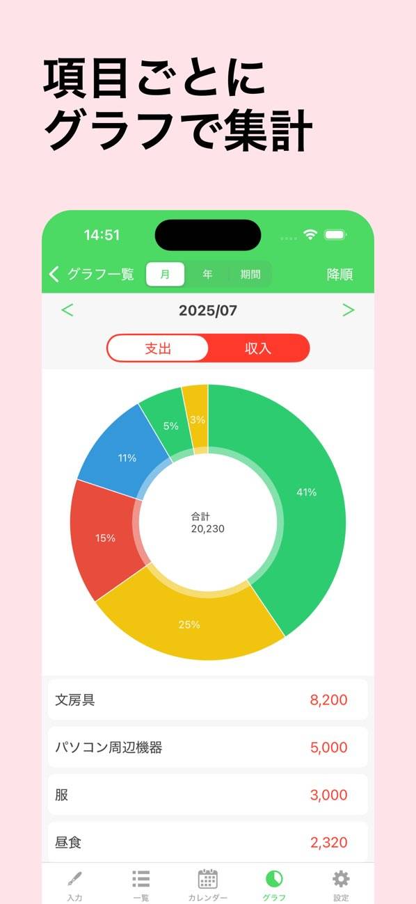 - 棒グラフや円グラフで、何にお金を使用しているか一目瞭然