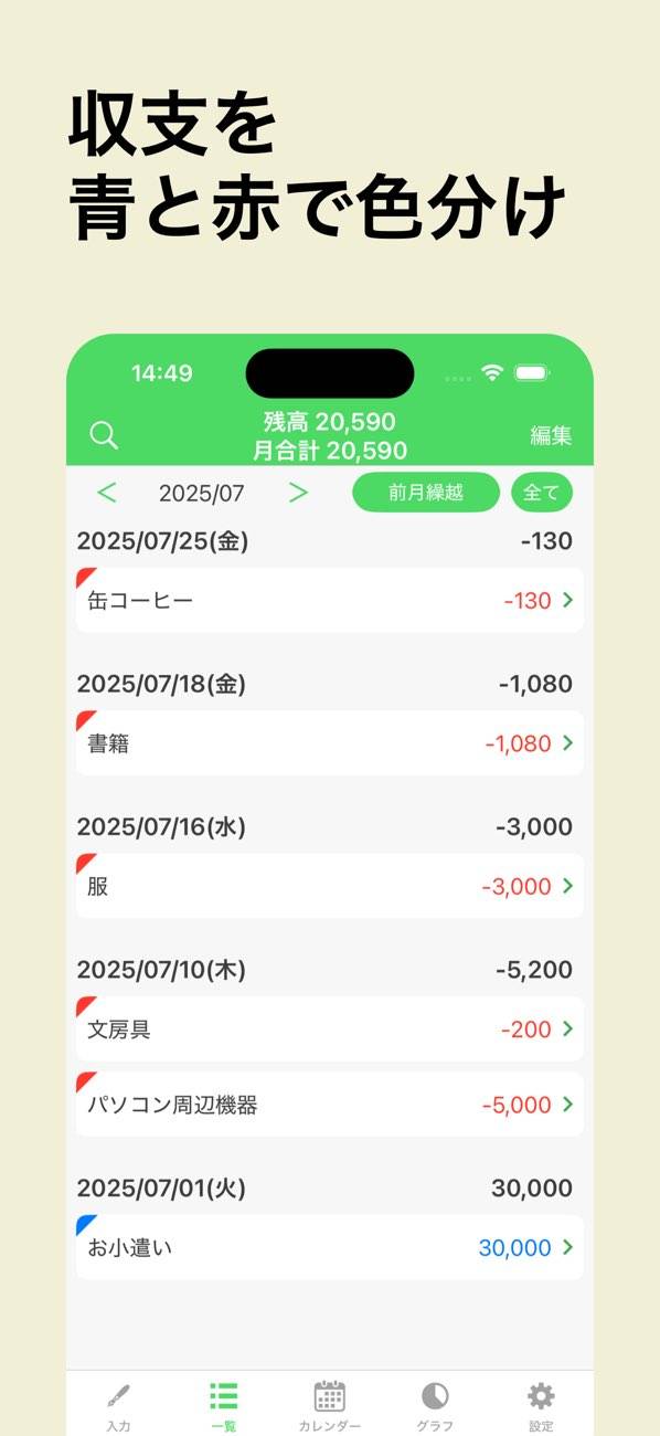 日付・費目・金額の3つの項目だけを入力すると、収支が記録されます。過去に入力した項目は選択可能で、使わないものは非表示にすることも可能。月毎に収支が一覧になっているため、わかりやすいでしょう。
