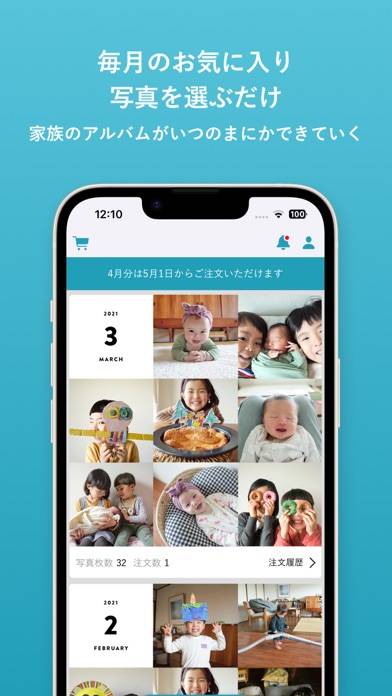子供の成長や家族の瞬間を、毎月無料でプリントできるアルバムアプリです。ましかく写真が届いたら、専用アルバムにしまうだけ。通知機能を搭載しているので注文を忘れる心配もなく、時間がない忙しい日々のなかでも無理なく続けられますよ。