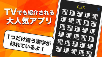 漢字をずーっと見ていると、何だか文字ではなく不思議な記号に見えてきたりしませんか?このゲームをやり続けると、そんな気持ちになります。画面に並ぶのは6×5=30個の漢字。一見、同じ漢字の羅列に見えますが、「圏」の中に「国」など、ひとつだけ違うものが紛れています。そいつを探し当てるゲームです。