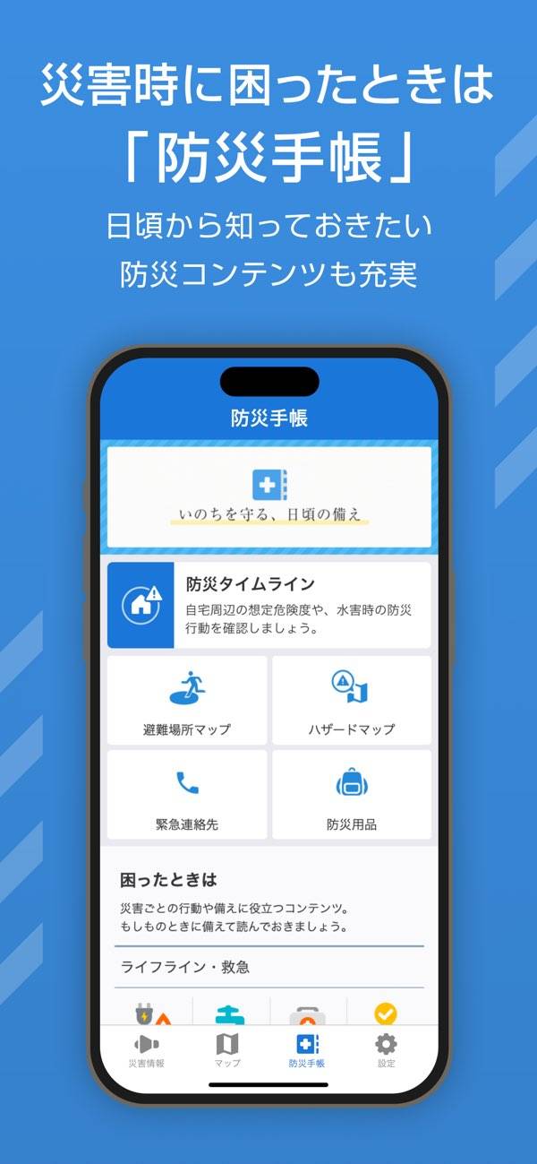避難所の情報、ハザードマップ、防災リストなども確認できます。普段の生活の中でも防災意識を高める手助けになります。