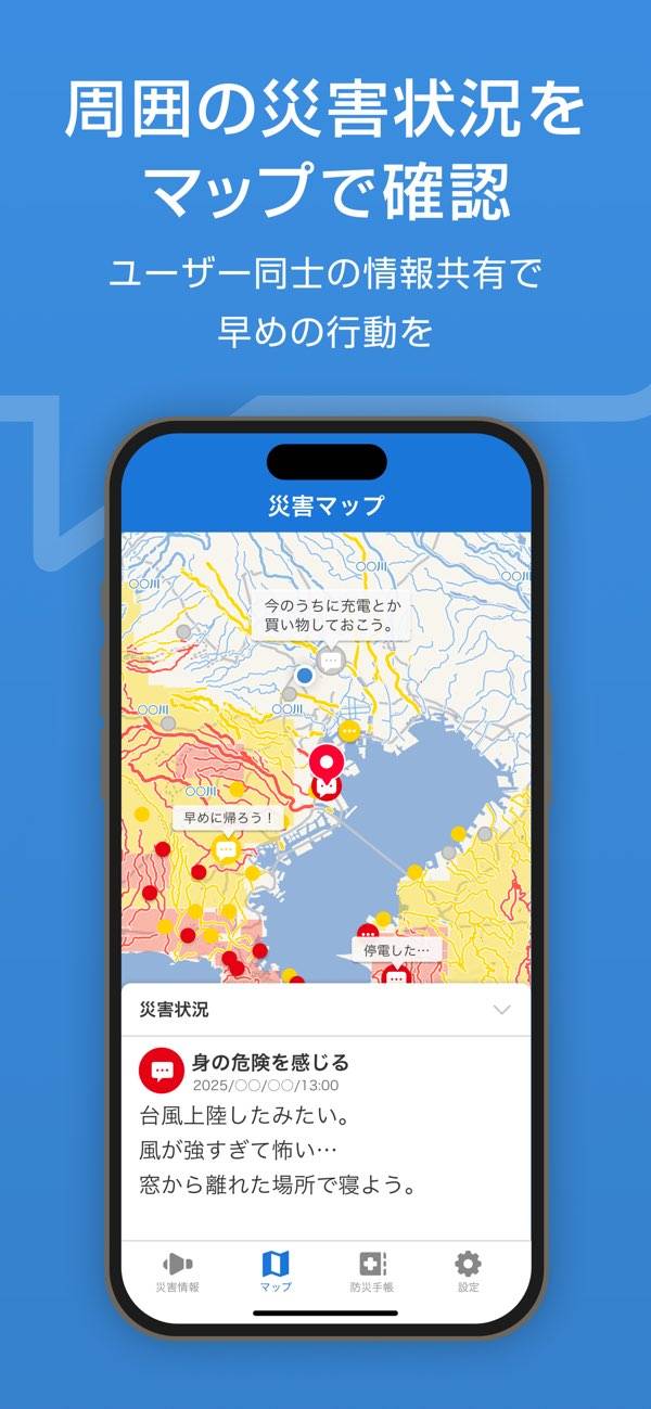 自分の住んでいる地域を登録しておくとリアルタイムの防災情報が飛んできます。また、台風や大雨の際は防災マップに氾濫や危険な場所等の口コミ情報が集まります。何年か前の大雨の際には近くの川が氾濫しそうになり、防災マップを確認することで避難するかどうか?の判断をしました。(口コミは「避難情報」「大雨危険度」「異常感知」が通知された際に書き込めるようになるので、その時必要な情報が手に入る仕様になっています。)非常事態でかなり頼りになるアプリです。
