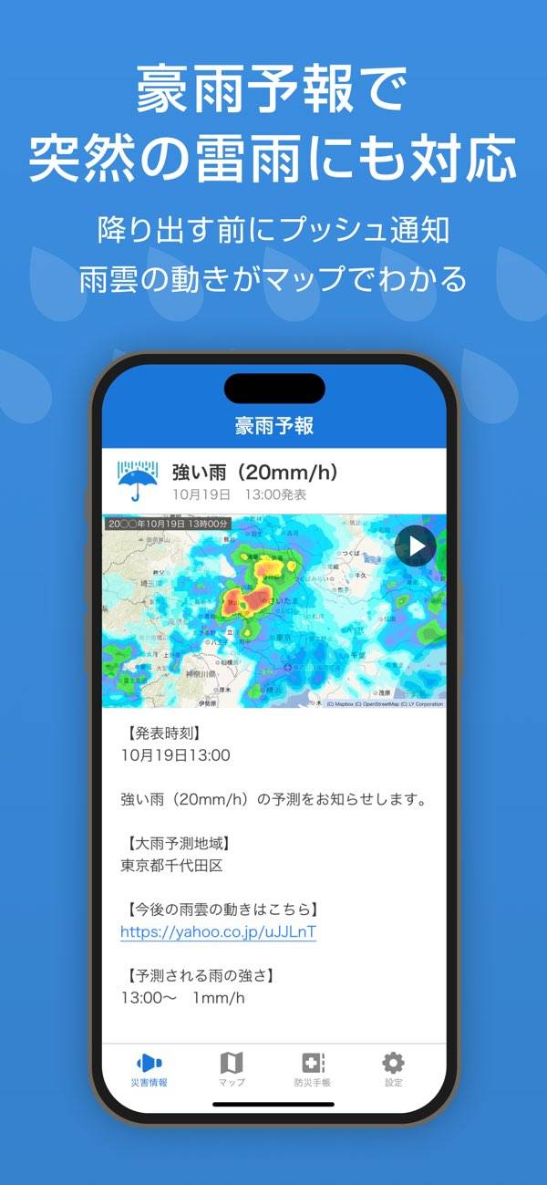 雨が降り始める前に通知される豪雨予報機能で、突然の雨でも落ち着いて行動できます。