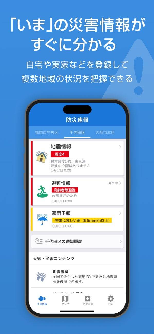 地震情報・大雨洪水警報などを事前に通知してくれます。
