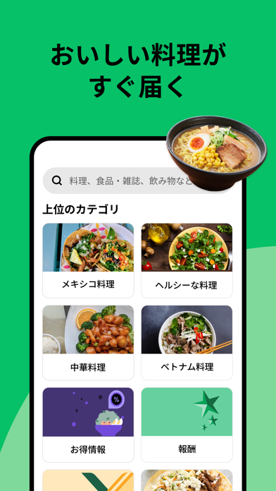 人気のチェーン店から地元のレストランまで、加盟店数の多さが魅力です。メニュー数は日々更新されるため、フードデリバリーサービスを頻繁に使う人でも飽きずに注文できます。料理だけでなく、食品・雑貨の配達も可能です。