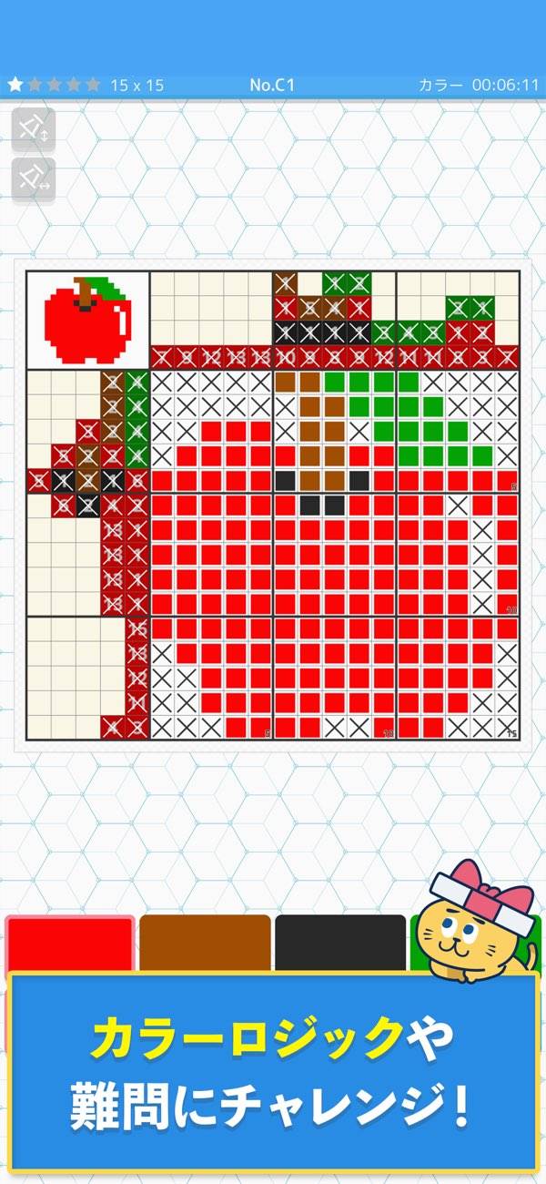 数字から推理しながら、マスを塗りつぶしていくロジックパズル。該当するマスをすべて塗りつぶすと絵が浮かび上がっていきます。5×5マスの簡単なステージが多く、ロジックパズルをあまり遊んでいない初心者でもすぐルールに慣れるでしょう。